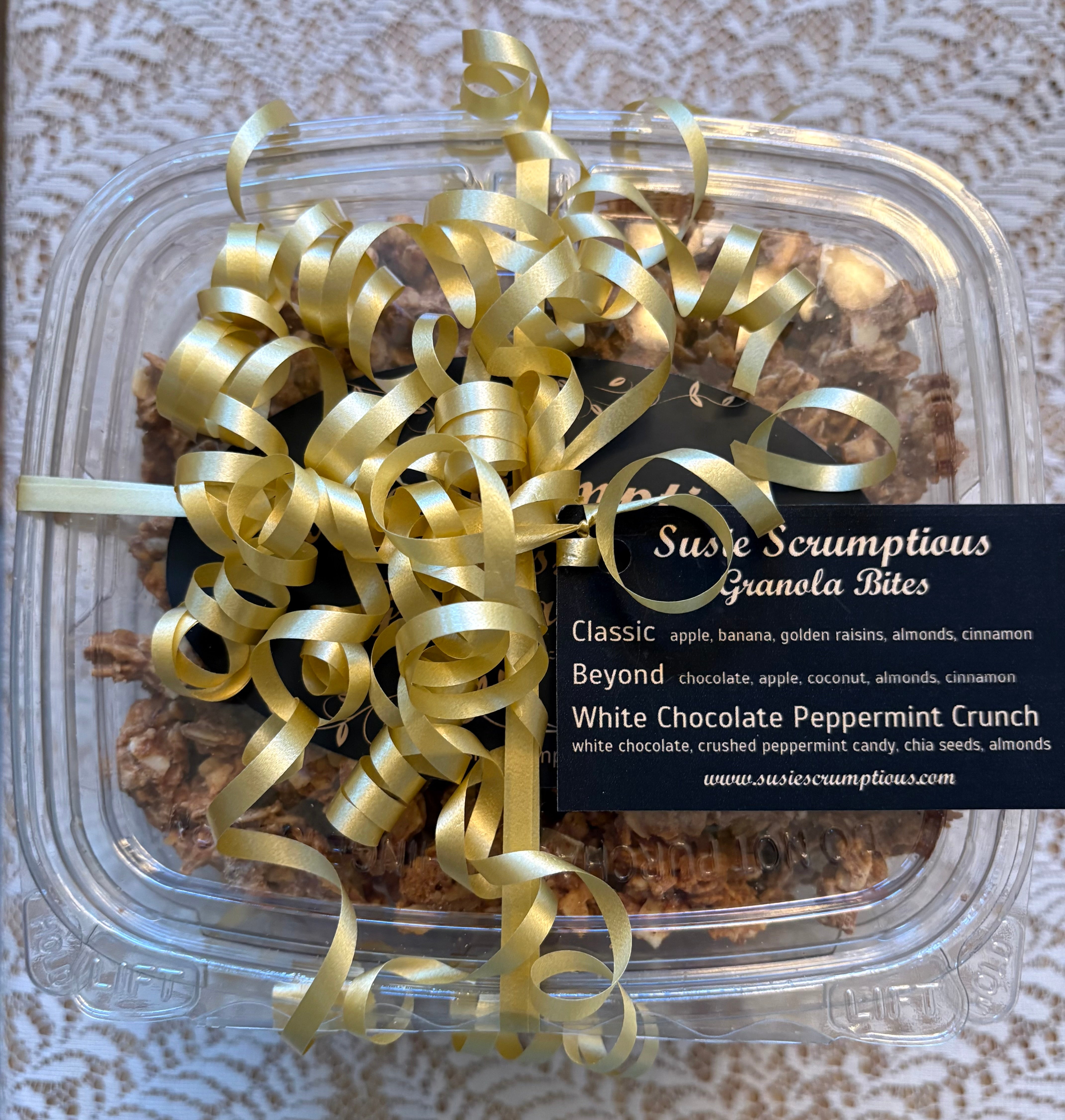 A Gift Tower of three scrumptious flavors - Classic, Beyond, and White Chocolate Peppermint Crunch Granola Bites. The Ultimate Holiday and Special Occasion Gift! Each Tower is bound with ribbon and an elegant card describing each flavor. A multi-item discount is applied to the Tower's price.